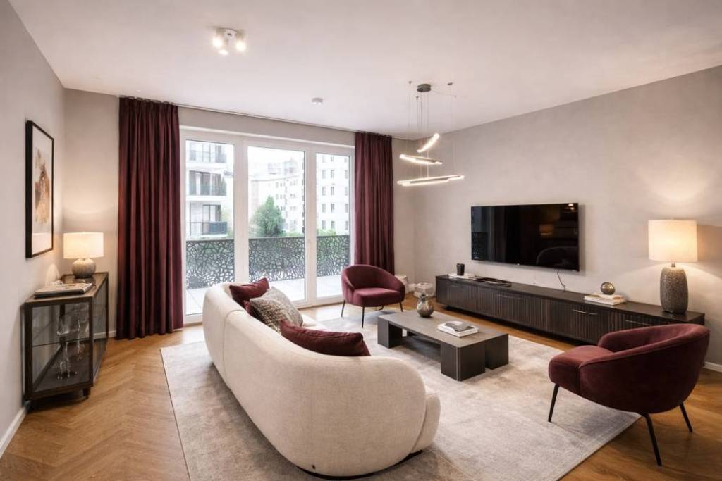 Premium fixtures such as high-quality oak parquet flooring, large doors, floor to ceiling windows and underfloor heating offer a feeling of both relaxing and prestige living. Bathrooms are equipped with both showers and bathtubs and are made of premium materials. The landscaped garden combined with spacious loggias, terraces and balconies offer a unique living experience in the heart of Berlin!