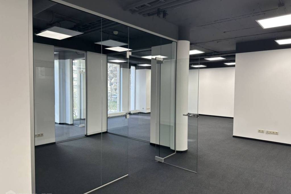A new, 108.9 sq.m open-plan office (including 23.4 sq.m of common areas) is available for rent. The space features a full interior finish and includes 2 meeting rooms on the 2nd floor of the building. It boasts large panoramic windows, open industrial/loft-style ceilings, and new LED lighting.