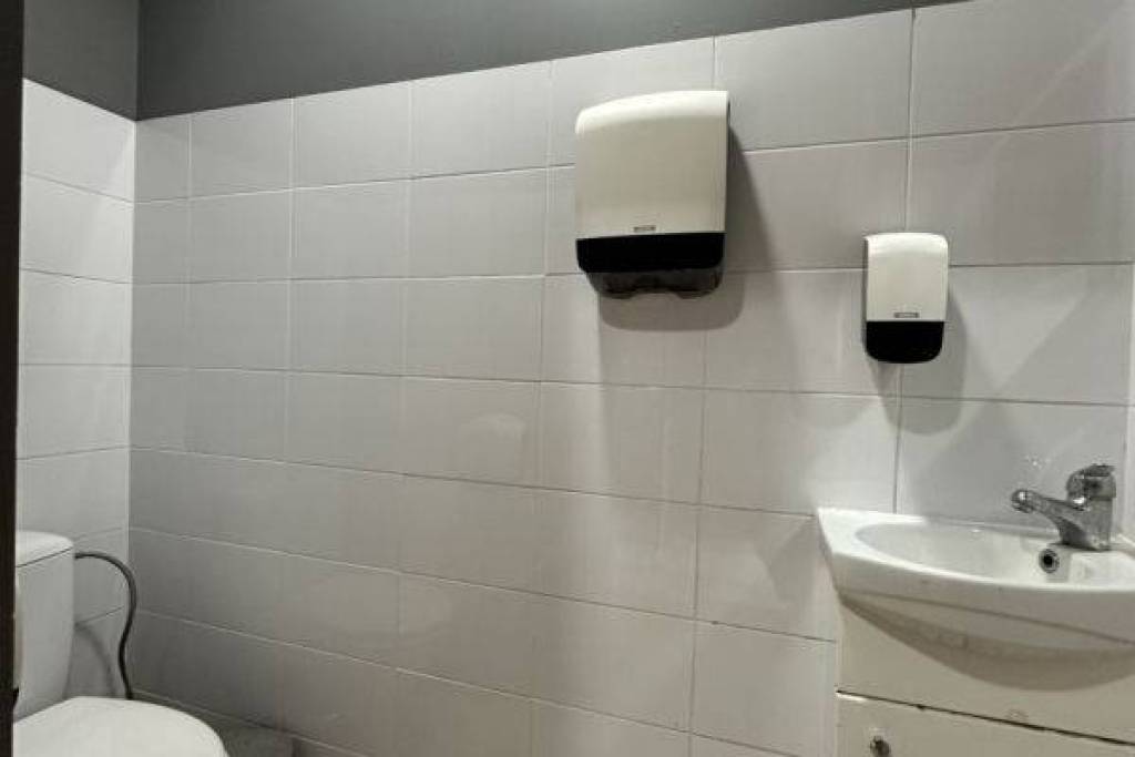 Layout: Spacious sales hall, small storage areas, and a restroom.