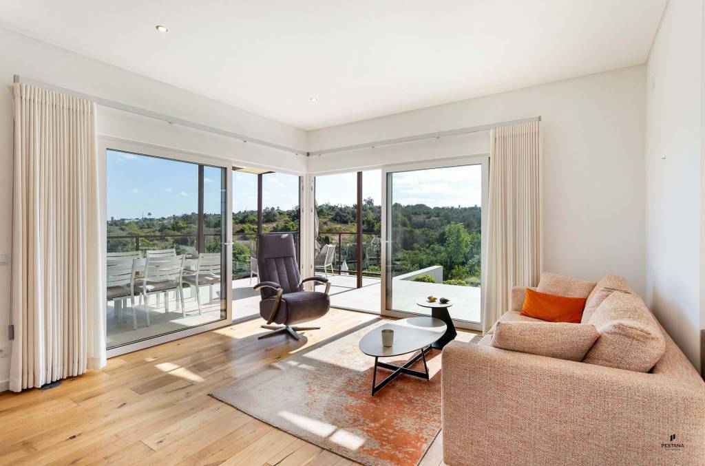 The elegantly equipped open-plan kitchen and living room feature large windows that provide abundant natural light and offer views of the Monchique mountains and surrounding greenery.