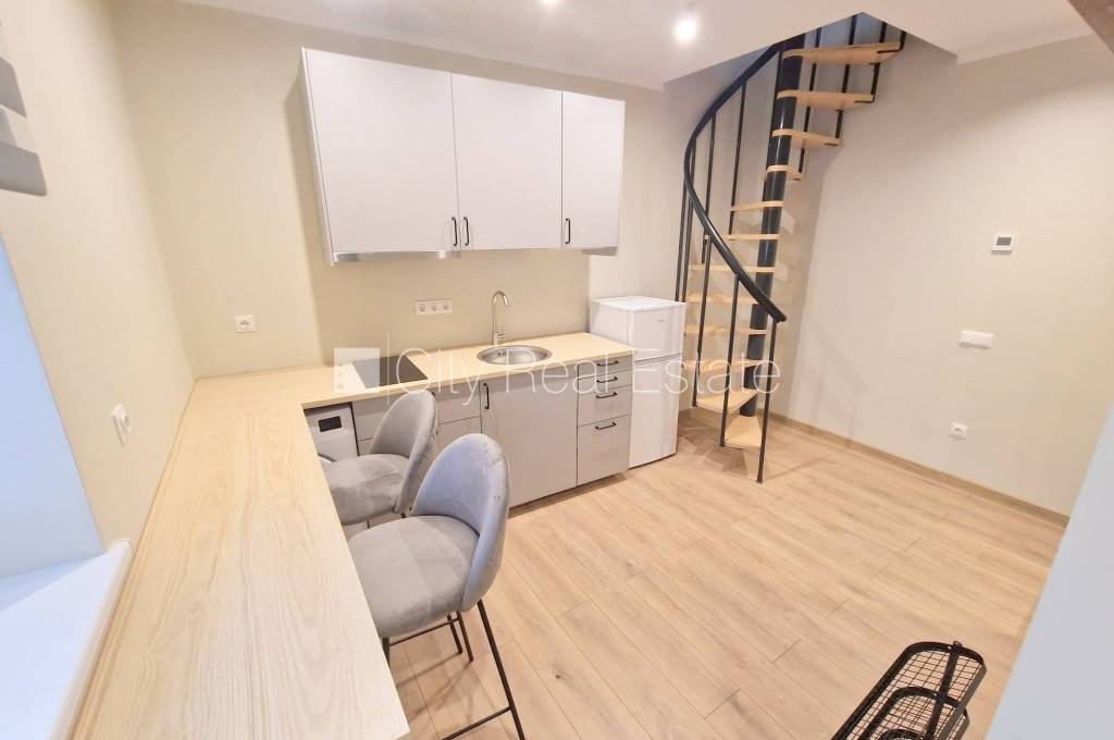Latvia, Riga, Tallinas street. Private house, courtyard building, renovated building, courtyard under protection, entrance from courtyard, windows are located on courtyard side, bedrooms 1 piece/es, two-storey, one room isolated, studio-type kitchen combined with living room, slantwise ceilings , high ceiling , heating counters, independent calculation for heating, plastic glass windows, roof windows, painted walls, new plumbing, laminate flooring, flag flooring, bathroom with WC, shower stall, toilet, build in kitchen unit, refrigerator, electric range, steam sip-off machine, washing machine, for one year, possibility to extend lease agreement, for six persons, available, by signing rental agreement you have to pay for the first rent month as well as you have to pay guaranty deposit, if you choose this real estate, you have to pay agency transaction commission which is equal with one half (50%) of this real estate month rental payment, CITY REAL ESTATE ID - 426735