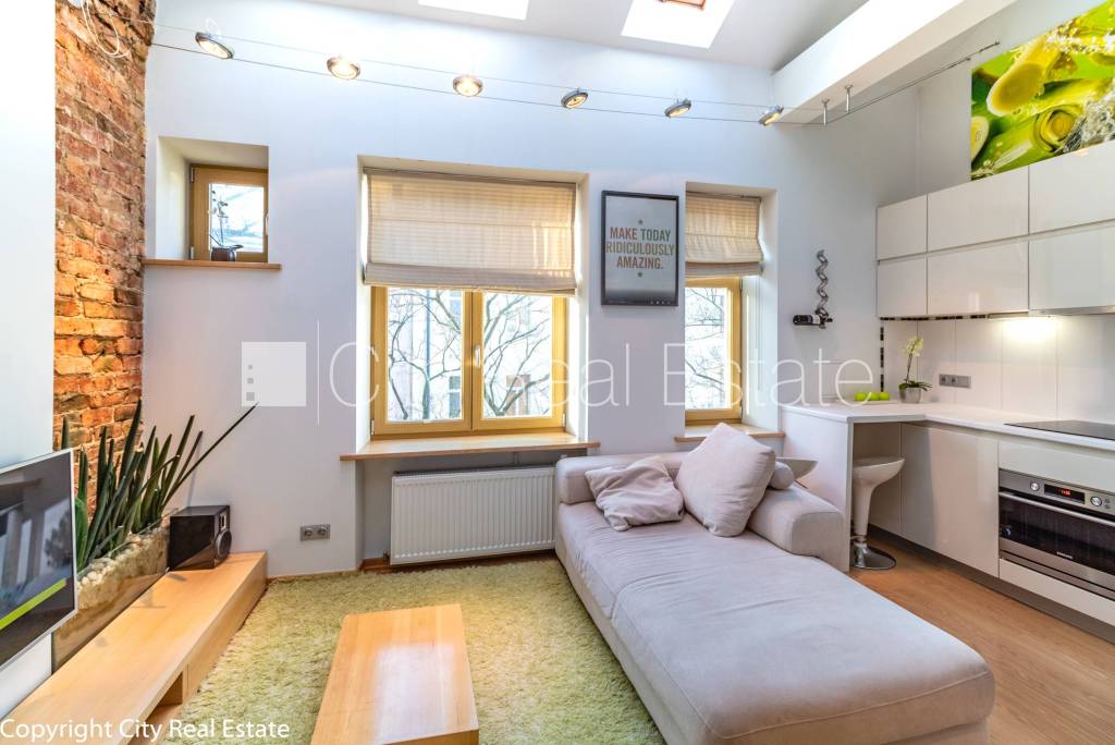 Latvia, Riga, Bruninieku street. Attic, french balcony, two-storey, central heating system, wood glass windows, roof windows, new wallpapers, new plumbing, build in lighting fixtures, laminate flooring, bathroom and WC separated, bath, build in kitchen unit, built-in wardrobe, air conditioner, television, refrigerator, electric range, oven, washing machine, internet, staircase doors under seven seals, CITY REAL ESTATE ID - 517193