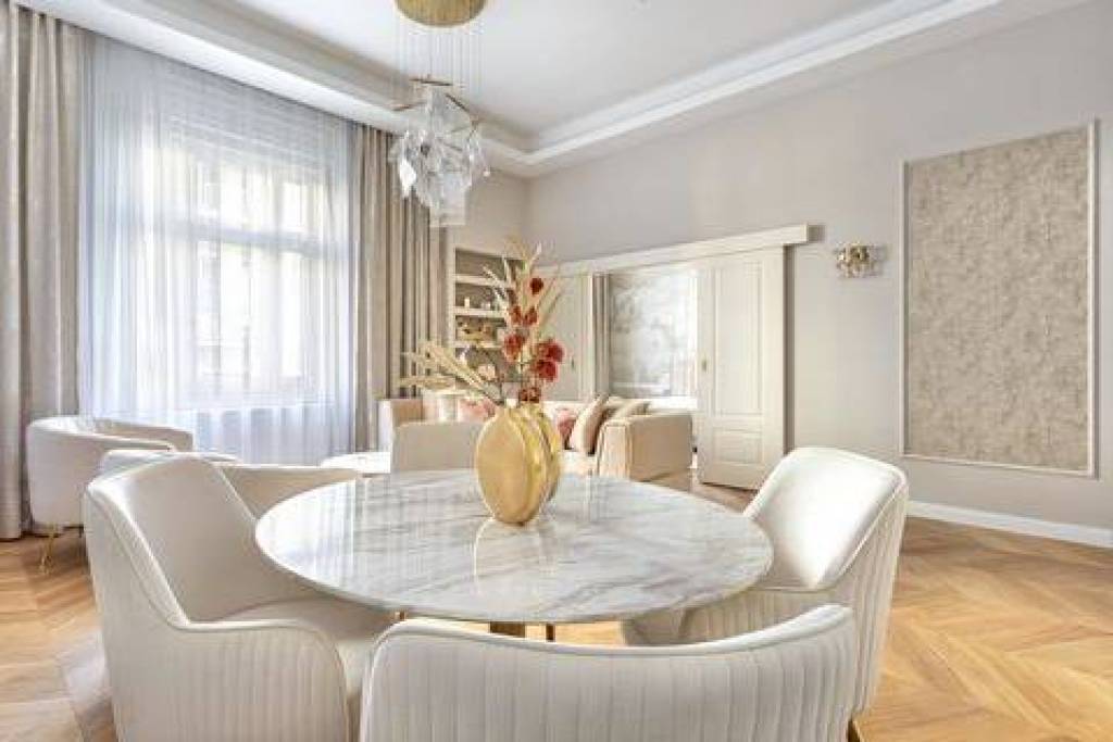 For sale: a luxury 89 m² apartment in the V. district, on Nyáry Pál Street, in the vicinity of Váci Street. The apartment features a living room plus two bedrooms, double comfort bathrooms, a guest WC, and is located on the 3rd floor. The property has undergone a premium-quality renovation using only the finest materials, reflecting elegance in every detail.