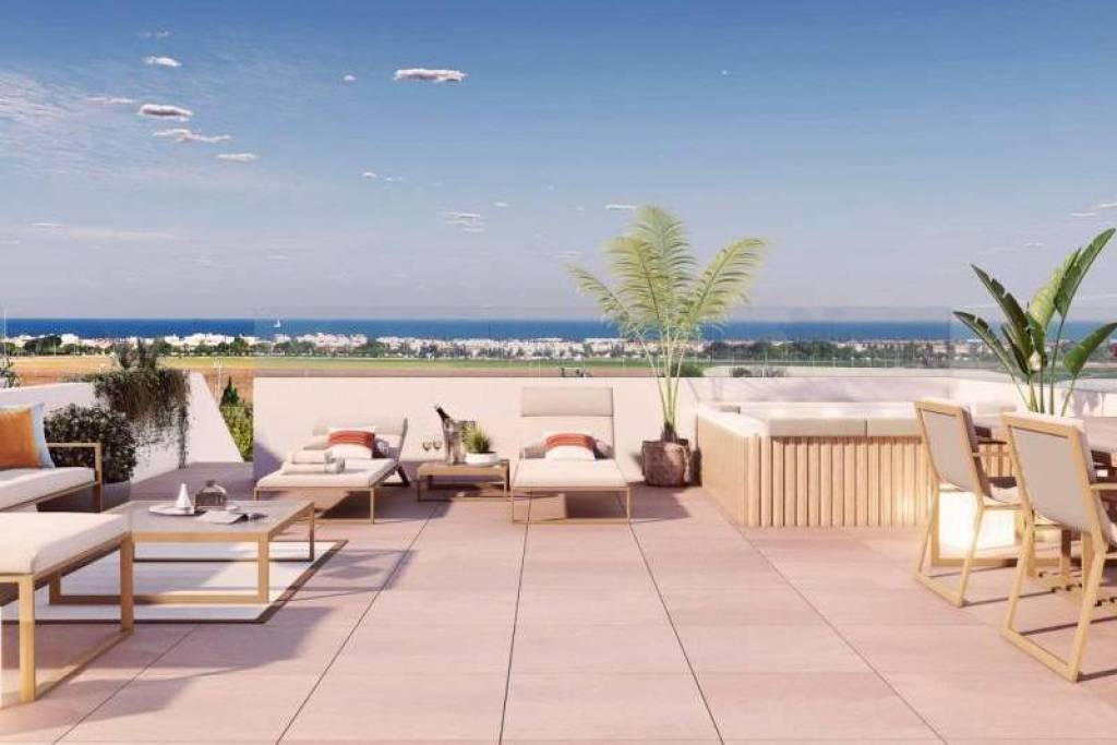 RESIDENCIAL DE OBRA NUEVA EN PILAR DE LA HORADADA Residencial de obra nueva de apartamentos y áticos con excepcionales acabados en Pilar de la Horadada. Apartamentos en planta baja con jardín privado, apartamentos en planta media con amplias terrazas y áticos en planta alta con solarium privado. La cocina se entrega totalmente amueblada, dejando espacio suficiente para que usted elija los electrodomésticos según sus preferencias. Sólo se han utilizado materiales nobles, como carpintería interior íntegramente de madera y ventanas exteriores Climalit/aluminio, ideales tanto por su diseño como por el alto nivel termo-acústico que poseen. Todas las terrazas están orientadas al sur. Puertas automáticas en el residencial, tanto para el acceso peatonal como para el acceso de vehículos. El edificio está rodeado de zonas ajardinadas, contará además con piscina comunitaria, aparcamiento dentro del complejo y cada vivienda dispone de su propio trastero privado. En las inmediaciones de este residencial encontrará todas las facilidades de transporte público, colegios, supermercados, centros comerciales, campos de golf y fantásticos parques municipales con sus zonas infantiles. Todo a tu alcance para que disfrutes de una excelente ubicación. Pilar de la Horadada es un típico pueblo español en la parte más meridional de la Costa Blanca. La gran calle principal tiene supermercados, muchas tiendas, restaurantes y bares y algunas plazas encantadoras. Las hermosas playas de Torre de la Horadada y Mil Palmeras con paseo marítimo de arena fina está a sólo 5 minutos. Los aeropuertos de Corvera (Murcia) y Alicante están respectivamente a 40 y 55 minutos.
