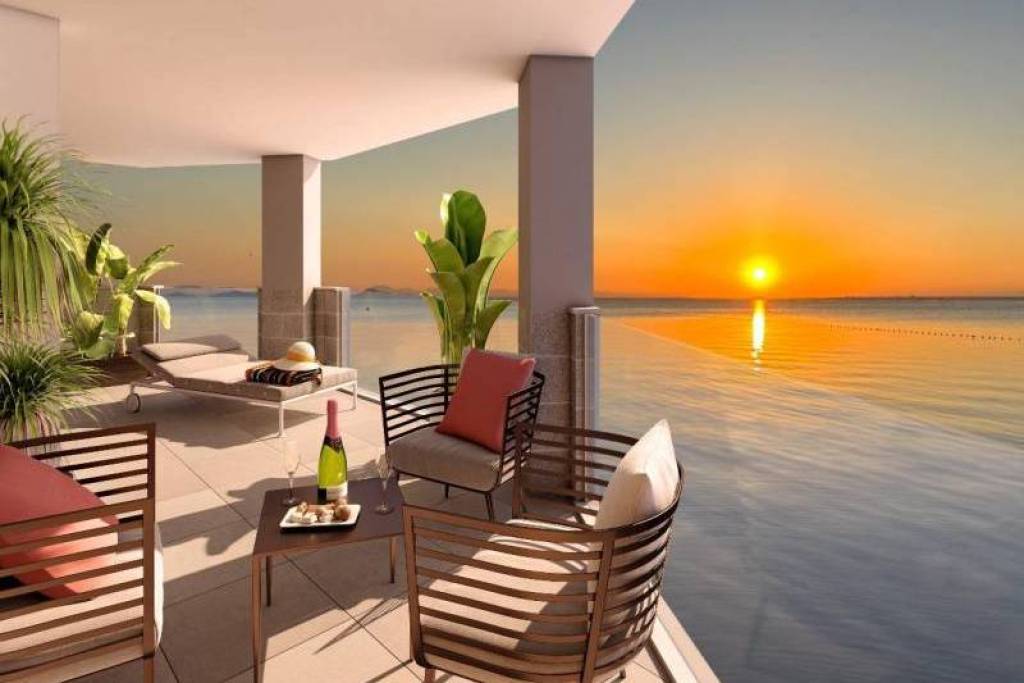 RESIDENCIAL DE OBRA NUEVA EN LA MANGA Complejo residencial de obra nueva situado en un lugar único y especial, entre dos mares, en una ubicación privilegiada y con todos los servicios que pueda necesitar a su alcance en la Región de Murcia, precioso litoral con playas de aguas transparentes y poco profundas. En este complejo residencial los apartamentos han sido diseñados para aprovechar hasta el último rincón de la vivienda, así como la elección de los materiales y el diseño de las viviendas. Viva un mundo de sensaciones y momentos placenteros con todos los servicios y actividades que desee a su alcance. Instalaciones - Aire acondicionado: Sistema de climatización por conductos, para frío y calor, en toda la vivienda (excepto en distribuidores y baños) y accionado por consola central. Electrodomésticos: Horno de acero inoxidable. Placa vitrocerámica negra de tres fuegos. Frigorífico de acero inoxidable. Campana extractora integrada en mueble. Lavavajillas integrado. Zonas comunes: Acceso al edificio a través de puerta de PVC blanco y doble acristalamiento con cámara de aire. Vestíbulos y peldaños de escaleras especialmente decorados con mármol nacional. Barandilla de aluminio termolacado blanco en escaleras interiores. Iluminación por detección de presencia en sótano y zonas comunes interiores. Puerta de acceso a garaje seccional motorizada blanca. Barandillas de urbanización de acero inoxidable. Videoportero. Antena parabólica con canales europeos. Piscina con solarium ajardinado. La Manga del Mar Menor es una franja natural rodeada por dos mares, el Mar Menor y el Mar Mediterráneo. A esta rareza se suman las múltiples opciones de ocio y tiempo libre, restaurantes, supermercados, censos médicos, farmacias, censos de deportes náuticos, campos de golf. La Manga está situada en el litoral norte de la Costa Cálida y es un popular destino vacacional para los turistas. La estrecha franja de tierra que separa la laguna cálida del mar más frío posee un microclima único. Es una de las zonas más exóticas de España. El aeropuerto de Corvera está a 1 hora en coche y el de Alicante a 2 horas.