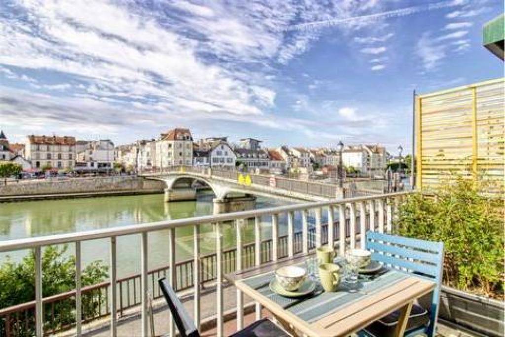 75 square meters flate for up to 4 persons. First floor: Balcony with gas barbecue, awning. Living-room with leather sofa, big screen TV, dining place. Fully equipped kitchen, bathroom and seperated toilets. Second floor: Quiet ensuite room (180x200 bed) with storage place. Twin bedroom (90x 190) with a peasant view over thr river and a table for home office. Storage place.