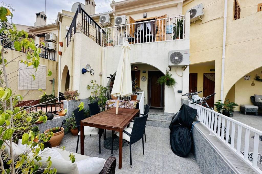Smart Properties se complace en ofrecer esta encantadora casa de un dormitorio en venta en la hermosa urbanización de Buenavista, Guardamar, a solo 600 metros de la playa. La casa tiene una superficie construida de unos 53 m² y en la planta baja encontrará una terraza, un porche con trastero, un salón con chimenea y una cocina americana. La escalera de mármol conduce a la planta superior, donde encontrará otro pequeño trastero, el baño familiar con ducha a ras de suelo, el dormitorio doble con armarios empotrados y puertas dobles de aluminio nuevas con persianas de aluminio que dan a un balcón con vistas despejadas. Hay aire acondicionado frío-calor en el salón y el dormitorio.