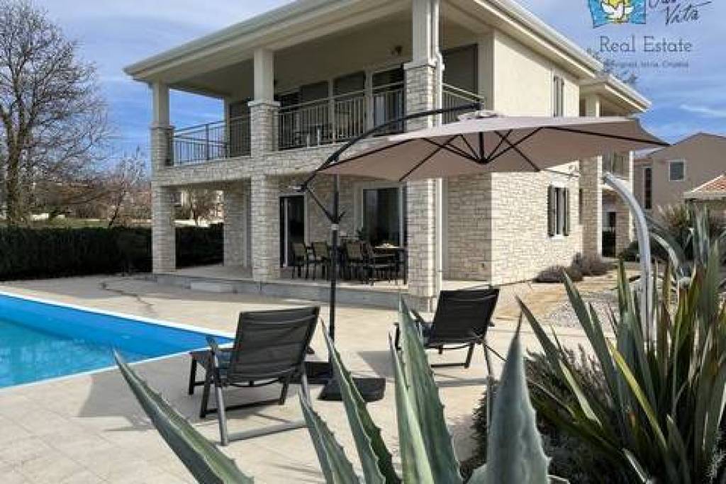 Beautiful stone house in a location 6 km from the sea and the center of Novigrad, with a unique sea view. It consists of a ground floor and 1st floor. Ground floor: entrance hallway, living room, kitchen, 1 bedroom, 1 bathroom, toilet, storage room, technical room, and a covered terrace connected to the pool. 1st floor: 3 bedrooms, 3 bathrooms, terraces. Situated in a quiet location where you can enjoy complete privacy and peace. Nicely landscaped yard, with plenty of greenery, flowers, and Mediterranean herbs. In front of the villa, there are 2 parking spaces. The entire house is equipped with a highly energy-efficient underfloor heating system with individual room regulation. The energy generator is a heat pump that also provides air conditioning for all rooms through the underfloor heating system. This system not only achieves very economical energy management but also creates a fantastic indoor climate because cooling takes place over large floor surfaces. Designed according to the calculated heating/cooling needs and equipped with separate air conditioners where necessary. All materials comply with German standards from well-known manufacturers. Heating system: Underfloor heating and cooling, insulation layers according to German standards, powered by a heat pump. Hot water preparation: Central stainless steel boiler with a hydraulic distribution system and programmable circulation. On the ground floor, the exterior walls are made of highly thermal insulating bricks with very good physical properties, vapor barrier, insulation, and massive natural stone 10 cm thick, giving a total wall thickness of 45 cm. On the upper floor, 35 cm, with a pressure-resistant facade with full thermal protection in accordance with EU directives. A significant part of the exterior walls or facade is made of solid stone as a double-layer wall. All interior walls are made of solid brick walls. The roof structure is constructed like a ceiling structure. Between the load-bearing structure and the roof, there is a triple layer of thermal insulation 15 cm thick. The roof is built as a woven version in a specific Mediterranean style with red clay tiles. So-called dry roof. The pool is 35 m² in size. Water treatment with a stainless steel UV sterilizer and a quartz sand backwash filter system reduces chlorine consumption by 70-80% and achieves significantly softer water that is skin-friendly. For more information: Miloš Šverko Tel: +385 98 856846 Email: miloscasavita@gmail.com ID NEKRETNINE: K117