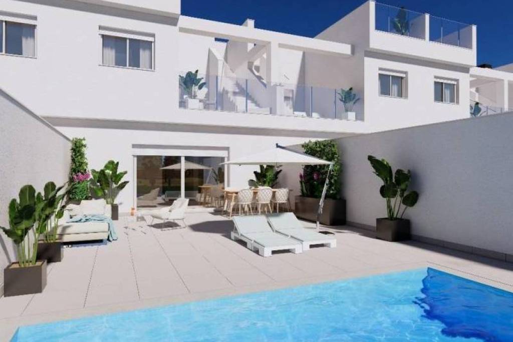 Maisons mitoyennes neuves en première ligne du golf La Serena à Los Alcázares Emplacement privilégié près du golf et de la mer Découvrez un lotissement résidentiel exclusif de 31 maisons mitoyennes neuves situées en première ligne du golf La Serena à Los Alcázares, à seulement 600 m de la Mar Menor. Situé au cœur de la Costa Cálida, cet emplacement privilégié combine golf, plage et style de vie méditerranéen. Avec toutes les commodités à proximité et un excellent accès routier, c'est l'endroit idéal pour les vacances et pour y vivre toute l'année. Maisons modernes avec piscine privée et solarium sur le toit Chaque maison présente un design contemporain élégant et des espaces intérieurs lumineux. Les maisons sont réparties sur trois niveaux plus un solarium sur le toit, offrant un maximum de confort et d'intimité : Sous-sol avec garage privé pour 2 voitures et accès à un patio Rez-de-chaussée avec salon et cuisine ouverts donnant sur un jardin et une piscine privée, 1 chambre et 1 salle de bains Premier étage avec 2 chambres, 1 salle de bains et 2 terrasses Solarium sur le toit avec cuisine d'été, idéal pour se détendre et profiter d'une vue panoramique L'orientation est et ouest garantit un excellent éclairage naturel et une vie en plein air tout au long de la journée. Finitions de haute qualité et confort Ces maisons sont construites selon les normes les plus élevées et offrent des caractéristiques haut de gamme, notamment : Piscine privée Garage en sous-sol pour 2 voitures avec porte motorisée Système d'eau chaude aérothermique Climatisation gainable entièrement installée Cuisine meublée et équipée Salles de bains entièrement équipées avec meubles, miroirs et parois de douche Porte d'entrée sécurisée Vivez entre la mer et le fairway Nichée au cœur d'un paysage méditerranéen luxuriant, cette communauté exclusive offre une vie paisible à proximité du parcours de golf Serena, un parcours 18 trous réputé, entouré par la nature et des lacs tranquilles. Les eaux chaudes et peu profondes de la Mar Menor sont parfaites pour la baignade et la pratique de sports nautiques tels que la voile, le paddle surf et le kayak tout au long de l'année. Distances clés : Plage (Mar Menor) : 600 m La Serena Golf : à côté du complexe Centre de Los Alcázares : 2 km Carthagène : 22 km Ville de Murcie : 40 km Aéroport de Murcie : 30 km Aéroport d'Alicante : 90 km Assurez-vous un style de vie méditerranéen Que vous recherchiez une résidence permanente, une maison de vacances ou un investissement rentable, ces maisons offrent luxe, confort et un style de vie côtier de qualité supérieure. Contactez-nous dès aujourd'hui pour organiser une visite et vous assurer votre nouvelle maison à Los Alcázares.