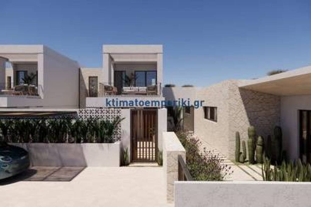 Upstairs, the first floor of 55 m² reveals two more master bedrooms, each with built-in wardrobes. One enjoys its own private balcony facing the water, while the other opens onto an impressive 30 m² terrace where the sweeping views of the Cretan sea create the perfect backdrop for morning coffee or sunset gatherings.