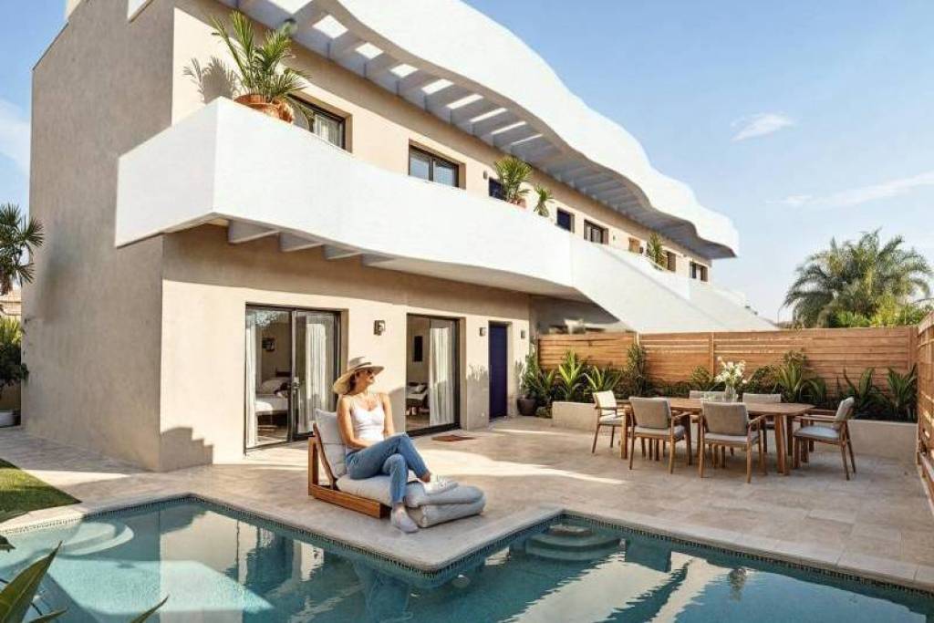 Boutique New Build Bungalows with Private Pool in Pilar de la Horadada, 2 km from beach Exclusive Development Near the Beach on the Costa Blanca Discover this boutique residential development of only six modern bungalows in Pilar de la Horadada, a charming coastal town located in the southern Costa Blanca. Just 2 km from the beautiful sandy beaches of Torre de la Horadada, this project offers a perfect blend of contemporary design, comfort and prime location. Situated in a central and well connected residential area, these homes are within walking distance of the town center, where you will find a wide range of shops, restaurants, cafes and all essential services. Pilar de la Horadada is known for its traditional Spanish atmosphere, welcoming community and relaxed Mediterranean lifestyle. Modern Bungalows with Private Outdoor Spaces All properties feature three bedrooms and two bathrooms, including a master bedroom with en suite bathroom. Buyers can choose between ground floor and top floor layouts, each offering unique outdoor living options. Ground floor bungalows include a private garden, private swimming pool and on plot parking, ideal for those seeking space and easy access. Top floor properties offer a private terrace and a rooftop solarium with private pool, as well as a designated parking space at ground level. The interiors are designed with open plan living areas, combining kitchen, dining and lounge spaces to maximize natural light and create a seamless flow throughout the home. High Quality Finishes and Contemporary Features These new build homes are constructed using high quality materials and finishes. Features include smooth plaster walls, porcelain flooring throughout and built in wardrobes. The modern open kitchens come fully furnished and equipped with appliances. Additional features include pre installation for ducted air conditioning, aerothermal system for energy efficient hot water, LED lighting package, electric shutters and video intercom system. Bathrooms are fully fitted with vanity units and mirrors, offering both style and functionality. Prime Location Close to Beaches, Golf and Amenities Pilar de la Horadada offers an ideal location for both permanent living and holiday homes. The nearby beaches of Torre de la Horadada are approximately 2 km away, known for their golden sand and clear waters. Other key points of interest include Lo Romero Golf 6 km, La Zenia Boulevard shopping center 15 km, Murcia Corvera Airport 40 km and Alicante Airport 55 km. The area also benefits from excellent road connections to nearby coastal towns, marinas and leisure facilities. Ideal Investment Opportunity on the Costa Blanca This exclusive development offers a rare opportunity to own a stylish new build bungalow in a highly desirable location close to the sea. Contact us today for more information or to arrange a viewing and secure your new home in Pilar de la Horadada.