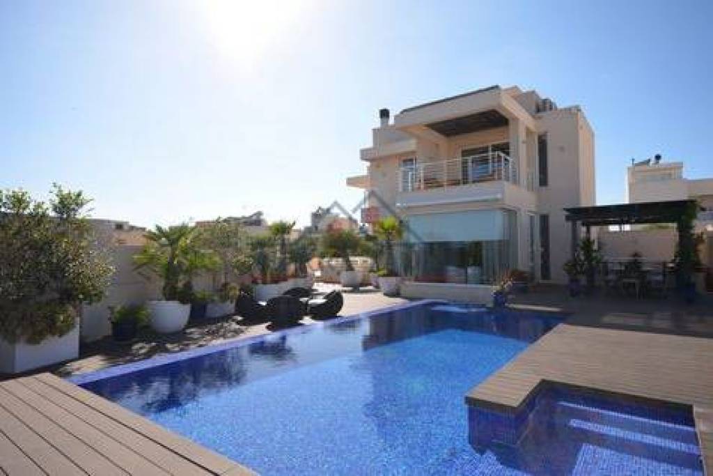 A private driveway leads to this magnificent villa comprising of an elegant hallway taking you to an open plan kitchen living dining with multiple exits to the pool and private terraces. The sunny decked pool area is complete with outdoor furniture and sunbeds making it spectacular and perfect for entertaining. Upstairs one can enjoy 3 double bedrooms main with en suite and large walk in wardrobe and a large main guest bathroom.