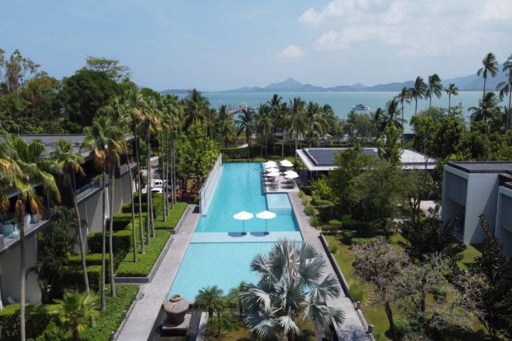 Contemporary and modern, spacious, duplex foreign freehold condo for sale at Baan Yamu, offering 2 bedrooms upstairs that share 1 large bathroom with dual access from the bedrooms. The master bedroom boasts tranquil views overlooking the lush gardens, feature pool, and surrounding hills.