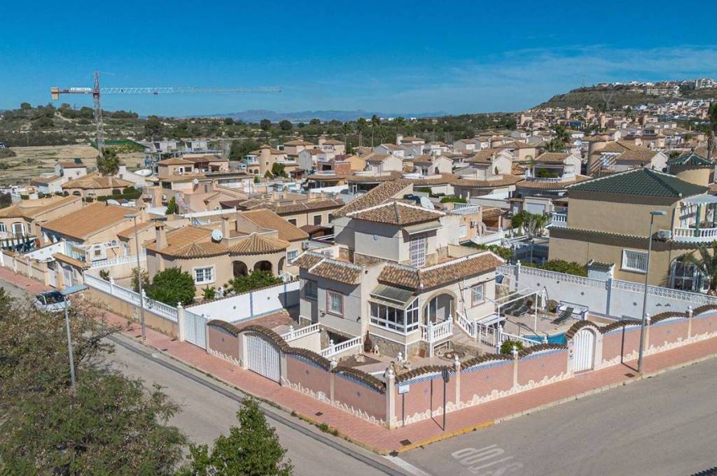 Set on a sunny corner plot of approximately 430 m², the property offers a private swimming pool, off-road parking and a garage. With a built area of approx. 210 m², the villa provides generous and versatile living space ideal for family living.