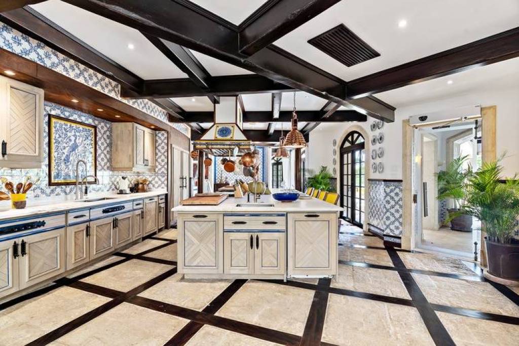 Inside, the custom kitchen is a chef's dream, and seamlessly marries the traditional with modern conveniences. For example, among the rich coffered ceilings, hanging copper cookware, and floors made with 18th Century stones reclaimed from a Spanish Colonial Convent, you will find a 60-inch Wolf gas stove, a 66-inch Wolf Pro Island Hood, dual ovens, a Bosh dishwasher, and a built-in Sub-Zero Refrigerator.