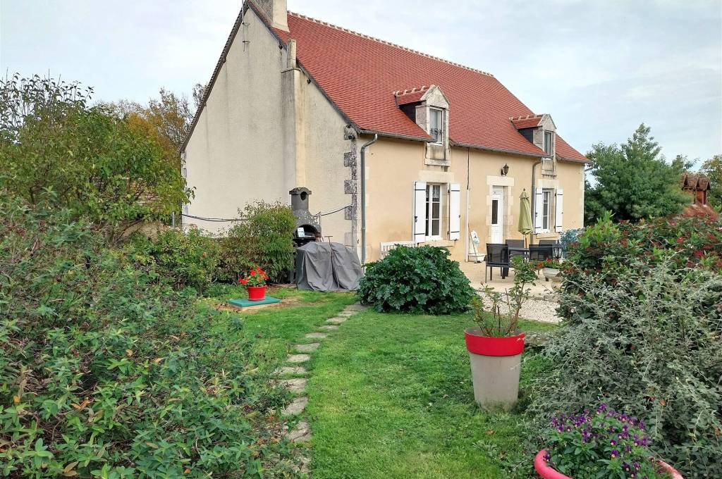 Nabij Le Blanc: huis in goede staat, rustig gelegen aan het einde van een doodlopende weg. Het heeft een keuken, eetkamer, woonkamer en 3 slaapkamers, waarvan een beneden. Boven is ook een bureau/slaapkamer en een strijkruimte. Groot bijgebouw, verdeeld in zomerkeuken, grote ruimte met bar, douche/WC, bergingen en een carport. Groot terrein met boomgaard en moestuin, mooie binnenplaats met toegangspoort en groot terras op het zuiden. Pluspunt: een gebouwtje waarin een boorput voor water!