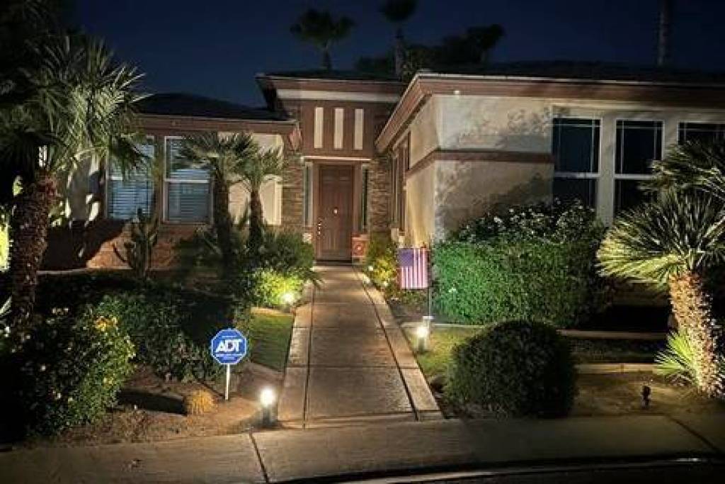 Further enhancing the value and comfort of the home are numerous practical and technological upgrades. These include custom concrete landscape curbing, textured concrete driveways and walkways, extensive mature landscaping with outdoor lighting, and a newly reinforced garage door. The home benefits from dual-pane tinted windows throughout, with custom drop-down shades installed in both the kitchen and living room. For comfort, ceiling fans with dimmable light switches are found in every room (excluding bathrooms). The residence is fully wired for wireless alarm security with ADT and includes five RING security cameras (four of which are solar-powered) for robust peace of mind. The location is strategically positioned just minutes from the I-10 freeway and the North Indio shopping district, providing convenient access to a massive array of major retailers, including Super Walmart, Home Depot, and countless dining options like IHOP, Chipotle, and Texas BBQ. For entertainment, the house is only 10 minutes from the Acrisure Arena and a quick 15-minute drive to the Coachella Music Festival grounds, establishing this desert oasis as the perfect blend of tranquil luxury and easy urban access.