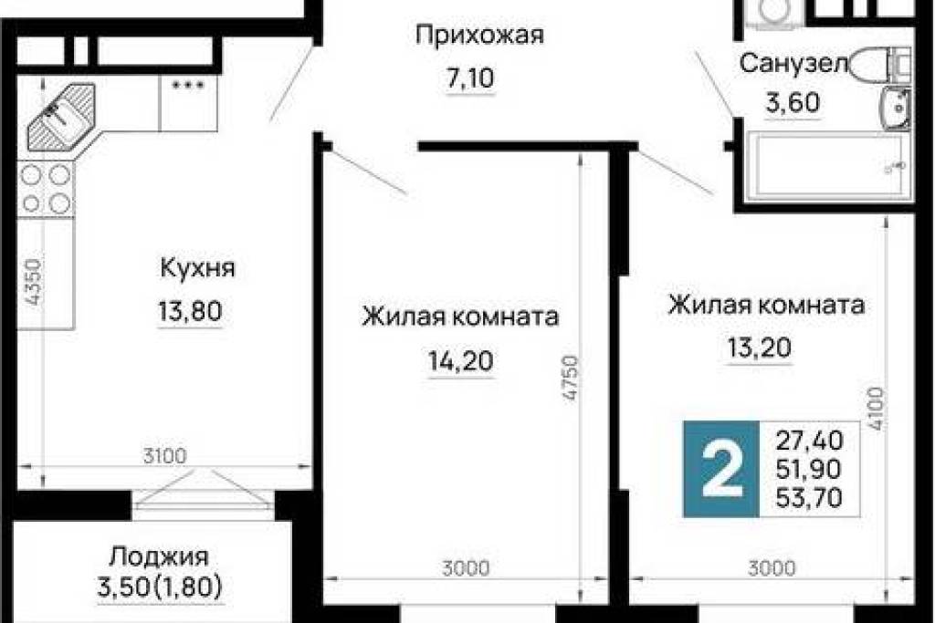 Жилая площадь 27.4 м2, кухня 13.8 м2, черновая отделка.