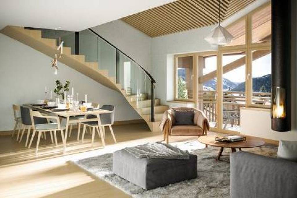 Spread across the third and fourth floors, this penthouse is by far the most impressive ski property for sale in this project. Spread over 156 m2, the apartment boasts five double bedrooms and a spacious and light-filled living room and kitchen of 36 m2. On the second floor, the living area and master en suite bedroom can be found, while 4 additional en suite bedrooms and can be found on the first floor. The penthouse benefits from a 12.8 m2 balcony on the lower floor accessible from the living room. In addition to all of this, a covered parking space, a cellar and a ski locker also come with the property.