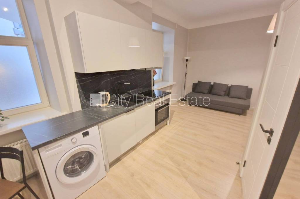 Latvia, Riga, Bruninieku street. Front building, renovated building, private territory, entrance from street, elevator, staircase after capital renovation, windows are located on courtyard side, studio-type kitchen combined with living room, high ceiling , central heating system, full decoration, plastic glass windows, painted walls, new plumbing, laminate flooring, flag flooring, bathroom with WC, shower stall, toilet, build in kitchen unit, pullout corner sofa, bed, kitchen table, chairs, wardrobe, refrigerator, electric range, oven, steam sip-off machine, washing machine, available, by signing rental agreement you have to pay for the first rent month as well as you have to pay guaranty deposit which is equal one month rent payment, if you choose this real estate, you have to pay agency transaction commission which is equal with one half (50%) of this real estate month rental payment, CITY REAL ESTATE ID - 511343