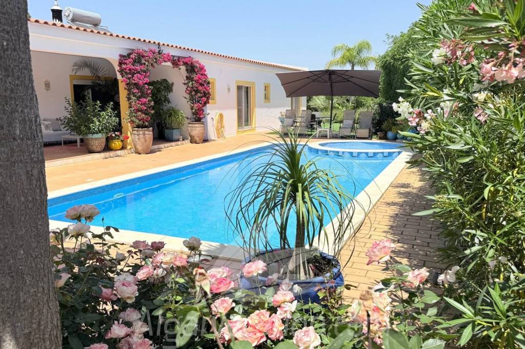 The garden, measuring a good 780m2, is beautifully landscaped with palm trees, a lemon tree, typical Algarve plants, and roses that exude a wonderful fragrance. It is a corner plot and is fully fenced, offering complete privacy; the house and pool area are not overlooked. The surrounding area is very popular, with various restaurants, and the beach can be reached in about 20 minutes. A wonderful property for permanent residence, holiday home or in combination with holiday rental.