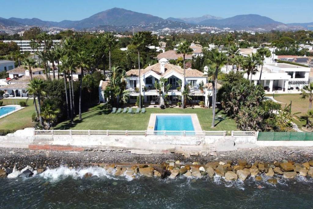 Situated on an elevated plot front line beach in the renowned Guadalmina Baja. This is an elegant residence situated in a gated community on the beach. The villa sits on a large level plot that offers total privacy and is not overlooked. The entrance to the villa is impressive with stunning manicured grounds leading up to the front door of the residence. You enter into a large hall with high ceilings and a twin staircase leading to the upper level. On the main floor, you have a large formal sitting room with a cosy reading room off to the left and the dining room to the right. From the dining room, you enter a spacious kitchen which in turn leads through to the laundry area and staff accommodation beyond. There are two large bedroom suites on the ground floor, one of which leads out to the gardens and pool. On the upper level, there are three large bedroom suites including the enormous master suite and all of these rooms have access to the upper terrace. The gardens and pool are well maintained and there is direct access to the beach from the property. There is a garage for two cars with plenty more parking available.